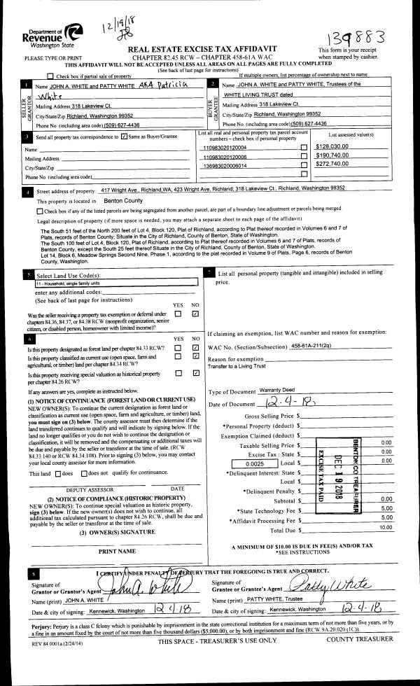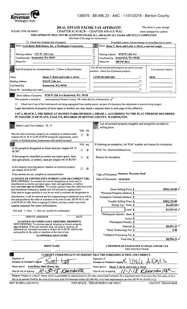 | 5 | 09/14/2018 | SWD | Statutory Warranty Deed | RICHLAND 132 LLC | HAYDEN HOMES LLC | 2018-027593 | | $820,500.00 | 137893 | |